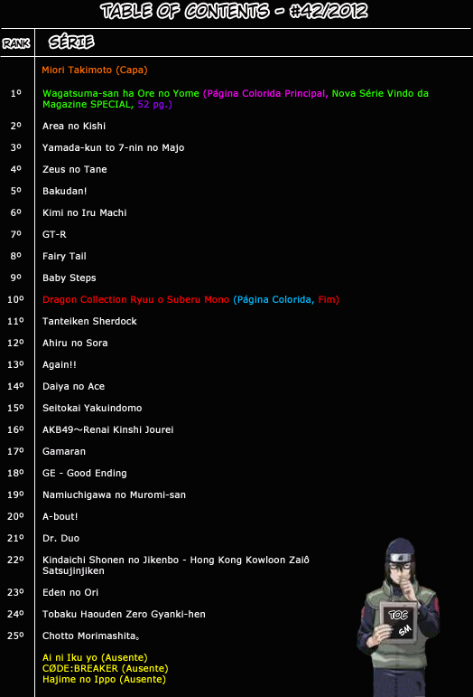 – Table of Contents é a ordem/índice que os mangás da revista são publicados durante cada edição, representando um ranking de popularidade. As séries que ficam mais acima no rank são as mais populares, já as que ficam mais abaixo no rank são as menos populares e que por isso correm riscos de cancelamento.