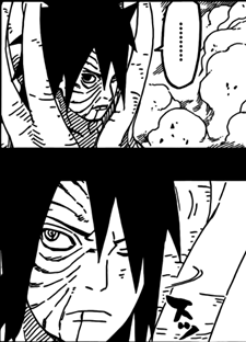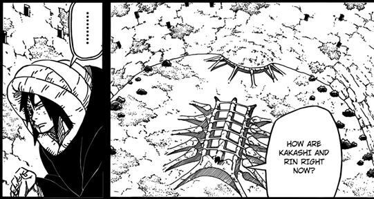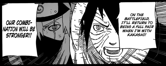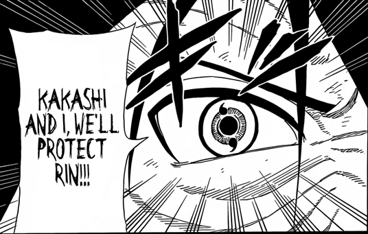 Depois disso, o ‘’cara da espiral’’ diz que provavelmente estarão entrando em batalha e que como ele é mais forte que Obito, que estava com seu corpo estava frágil, ele achava melhor ele lutar. Obito interrompe dizendo que Madara tinha contado que o Sharingan pode despertar o seu potencial quando estão juntos e que como o Kakashi estava com o seu outro olho, a combinação deles ia ser melhor. E termina gritando que ele e o Kakashi iam proteger a Rin. O ‘’cara da espiral’’ concorda, dizendo que como o corpo artificial de Hashirama estava ligado a Obito, se ele usasse as habilidades de Senju e Uchiha, poderia ser que ele conseguisse um poder jamais visto.