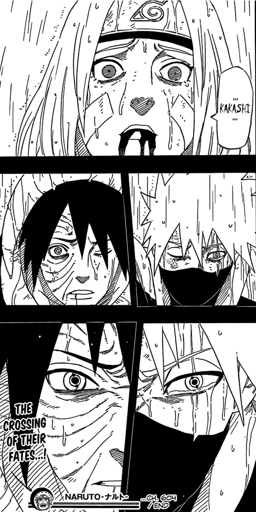 Obito não acredita no que via e diz para si mesmo parar de imaginar coisas estranhas. Até que finalmente ele chega ao local e… fica completamente espantado, chocado, paralisado com a cena que está presenciando! Era nada mais, nada menos que o Kakashi perfurando o peito da Rin com o seu Chidori. Nesse mesmo momento a Rin fala: ‘’Kakashi’’ com aquela cara de espanto e choro por ver o amor de sua vida tirando a sua própria vida! Depois mostra a cara do Kakashi e de Obito e quando mostra elas mais de perto ainda, vemos então Kakashi chorando e Obito ficando brabo e quase chorando ao mesmo tempo. E assim o capítulo termina.