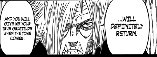 Ainda assim Obito responde falando que provavelmente não voltaria mais para lá e agradece novamente por tudo. Madara responde: ‘’Você… com certeza retornará. E me dará sua verdadeira gratidão quando a hora chegar.’’ Obito apenas olha para Madara com uma cara muito séria. Sinceramente, isso que o Madara falou foi muito suspeito, provavelmente Madara tinha formas de garantir que Obito ficasse ao seu lado e talvez uma delas seja o que acontece no final desse capítulo épico.