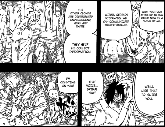 Cortando todo o clima tenso, Obito grita para o ‘’branquelo’’ perguntando onde a Rin e o Kakashi estavam e pedindo também para levá-lo até lá de uma vez. Nesse momento o ‘’branquelo’’ explica que quem está grudado no corpo de Obito é basicamente um de seus clones e que sendo assim, poderiam se comunicar por telepatia dependendo da distância um do outro. Disse também que tinha vários outros clones posicionados de baixo da terra e que por conta disso, trocariam informações por telepatia durante o caminho. O ‘’cara da espiral’’ também diz que levará Obito até o local utilizando essas informações. Obito agradece e diz que está contando com ele. To achando isso muito suspeito também, esses capangas do Madara tão bonzinhos demais pro meu gosto, aí tem coisa ein!