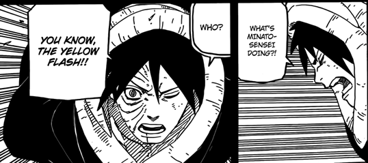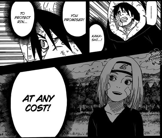 Obito na mesma hora grita inconformado perguntando o que ‘’Minato-sensei’’ estava fazendo naquela hora. O ‘’cara da espiral’’ explica que Minato estava ocupado em outra missão. Nesse momento Obito começa a se lembrar, em sua suposta morte, de quando pediu a Kakashi para proteger a Rin. Obito ainda fica falando para si mesmo que o Kakashi tinha prometido proteger a Rin a qualquer custo e que já estava quase chegando ao local.