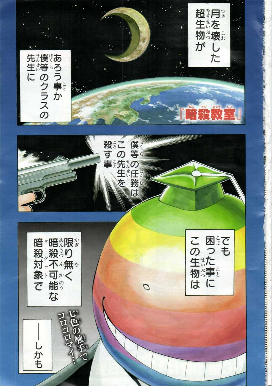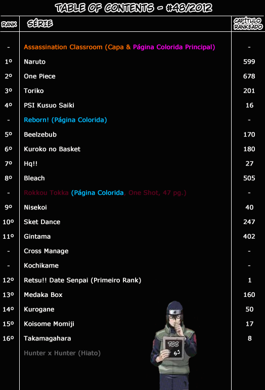 E cá estamos nós com mais uma ToC atrasada da Jump! E quem ganha a capa dessa edição é o novo sucesso da Shonen Jump, Assassination Classroom! O mangá que é muito popular entre os leitores, conseguiu essa façanha depois de apenas 17 capítulos! Lógico que a Jump fez isso pra divulgar ainda mais a série e também porque sabe que ela tem muito pontencial. Com certeza o primeiro volume do mangá, que sai agora em novembro, venderá muito bem.