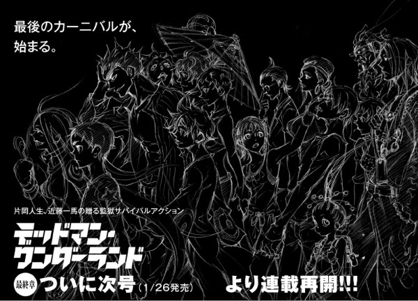 Depois de uma longa pausa que vinha desde abril devido a gravidez de Kataoka, que é quem escreve a série, o mangá de Deadman Wonderland estará retornando já na edição de fevereiro da revista Monthly Shonen Ace! A mangaka inclusive havia postado em novembro em seu blog oficial que voltaria a trabalhar na série em breve. Além dela, Kazuma Kondou forma a dupla de mangakás responsáveis por Deadman Wonderland, que foram os mesmos de Eureka Seven. Kondou, no entanto, é o ilustrador.