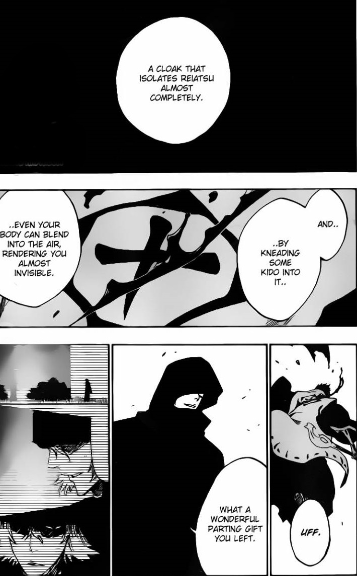 O Kubo-sensei é foda, quando o cara quer fazer um capítulo bom, ele consegue, é verdade que o arco dos Fullbringer não foi lá muito bom, mas esse último arco da guerra….Tá show. O capítulo começa com o nosso glorioso Aizen ” taichou” mostrando que mesmo depois de preso é foda, ele é um dos meus vilões favoritos da Shonen Jump. Bom, eu e o mundo inteiro já sabia que o Aizen estava envolvido com o Hollow que apareceu no mangá recentemente, isso não é novidade para ninguém, o que me surpreendeu foi a capa de invisibilidade que o Aizen estava usando, que não foi criado por um qualquer não, foi criada pelo nosso queridinho Urahara-san, esse aí é outro fodão de Bleach. Esse capa é bem interessante, além de isolar a sua Reiatsu quase que totalmente, ainda te deixa quase invisível, por esse motivo que o Isshin levou o corte nas costas.