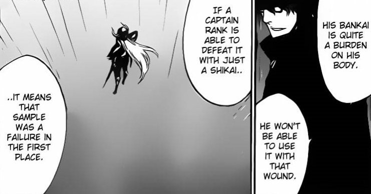 Depois de perceber que não recebeu aquele corte do Hollow, e sim de um Shinigami traidor, tentou encontrá-lo mas, como ele ía encontrar algo que ele não consegue ver não é mesmo. Logo depois o Kubo-sensei fez uma coisa que vai deixar muita gente ”p da vida” como eu estou agora, sim, estou falando daquela parte da qual o Aizen fala sobre a Bankai de Isshin, sim, a BANKAI dele, imagina só, se a Shikai dele é de fogo, podemos esperar um segundo Yamamoto Genryuusai, com suas chamas que tudo destroem. Se não vai mostrar a Bankai, pra que falar dela e aumentar as expectativas das pessoas, enfim, Aizen não fez aquele corte atoa, ele mesmo fala que com aquela ferida, ele não iria conseguir ativar a sua Bankai, nessa parte eu pensei, a Bankai dele com certeza é a mais foda que eu vou ver em Bleach, mais como eu estava dizendo, Aizen calculou tudo isso para medir o nível de força de seu experimento, ele fala que se um capitão sem usar a sua Bankai derrotar seu experimento, quer dizer que o experimento foi um fracasso, em partes em concordo com ele, quer dizer, depende de qual capitão está se enfrentando né. Outro coisa que ficou clara é em relação a aparência do Hollow, que era bem similar a de um shinigami em relação aos outros Hollows, o próprio Kaname, ou para quem prefere Tousen, fala que o Hollow foi o primeiro a ser criado sendo baseado na alma de um shinigami, então, obviamente teria que ter uma forma parecida com a de um shinigami, ele foi batizado de ”White” pela sua cor.
