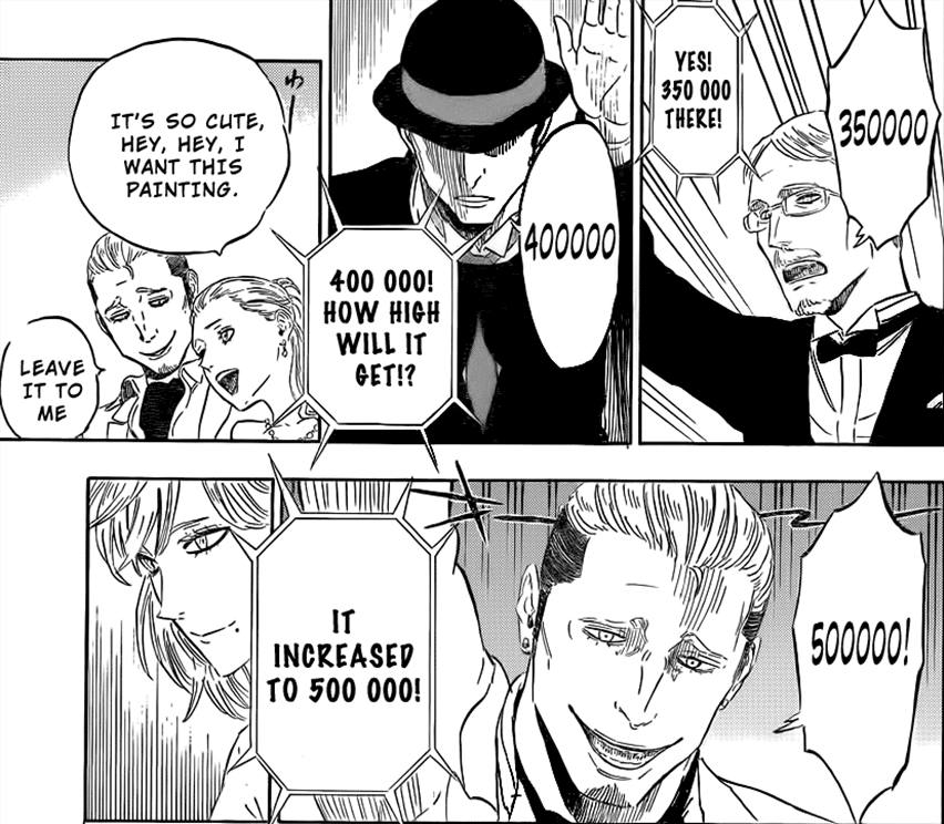 Começa o leilão da primeira pintura, e Lise afirma com certeza que não é a certa. E então ele finalmente revela que tem um Eureka, e mostra qual é o poder dele. Pelo que eu entendi ele tem uma espécie de visão de raio-X, e graças a isso ele consegue ver as camadas de tinta e até o forro do quadro pra saber qual é o certo. E também foi dessa forma que ele conseguiu tirar o veneno do corpo Haiji no capítulo anterior. E tudo se explica. ~
