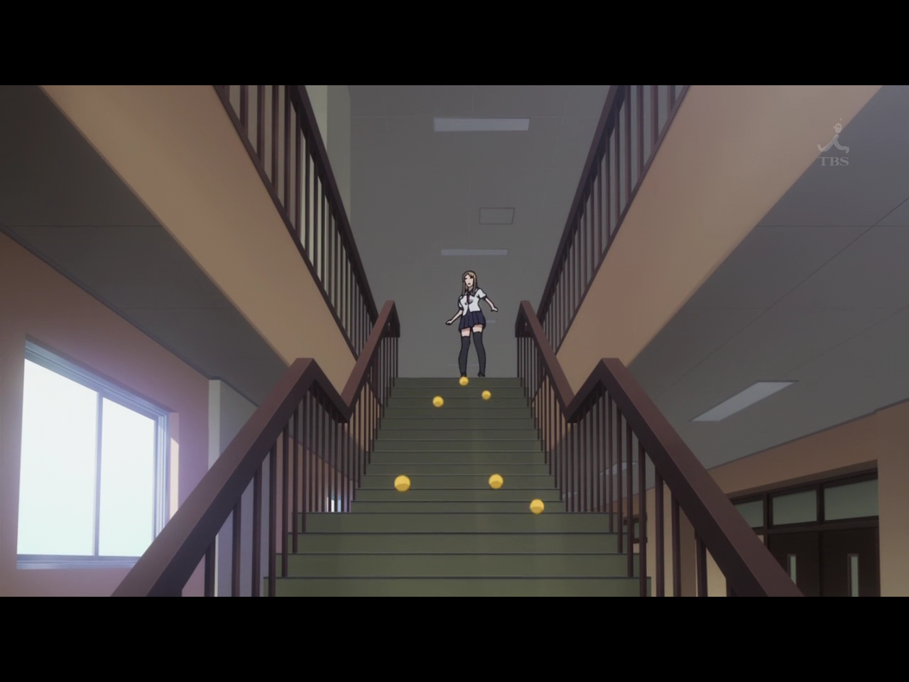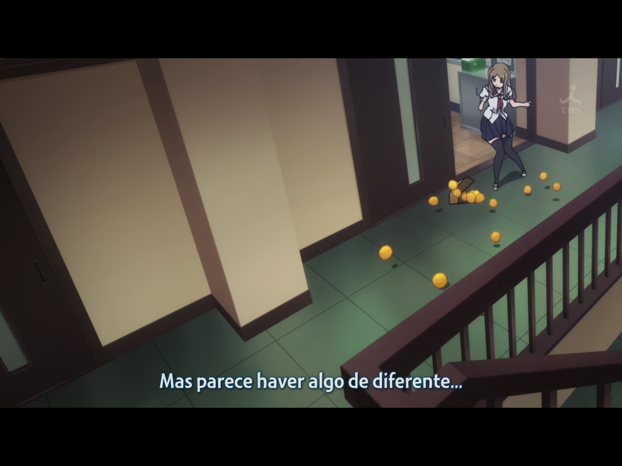 Outra coisa que foi muito WTF foi uma cena em que uma menina deixa cair suas laranjas sei lá de onde só que aquelas laranjas são mágicas! Ao invés de rolarem reto até sei lá onde, elas acabam fazendo várias curvas e descendo bem certinho pelas escadas. PORRA, COMO ASSIM! JDAIOSDJASIOJSOIJSAIOIAS. A menina ainda ficou desolada com o que aconteceu, chegou até a cair sentada. Depois disso eu fico imaginando quando acontecer algo realmente sério com a coitada, qual vai ser a reação dela? Com certeza vai ser algo muito tenso e escandaloso haha. Fiquem agora com as imagens das laranjas mágicas que escolhem aonde querem ir: