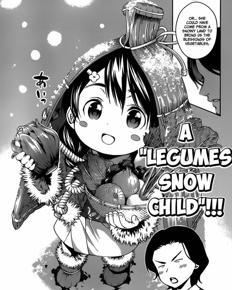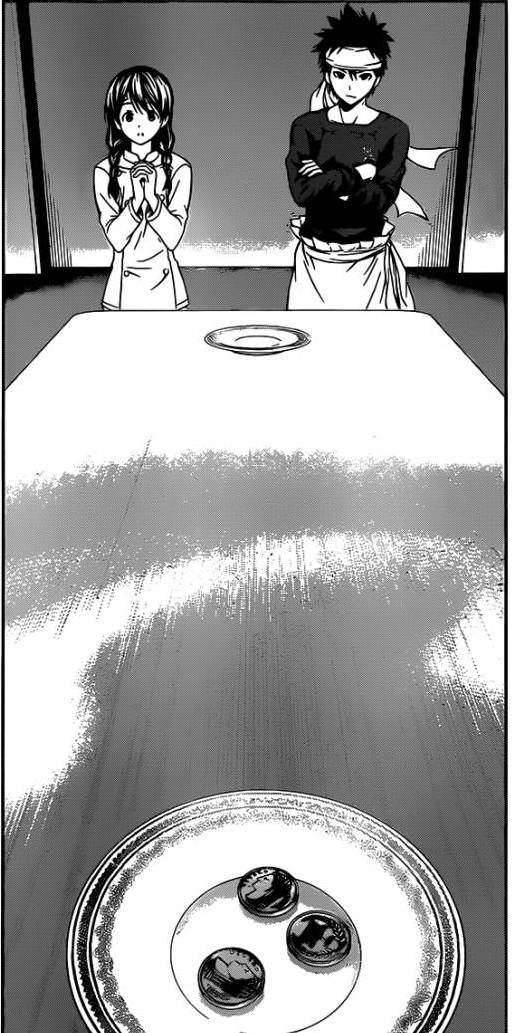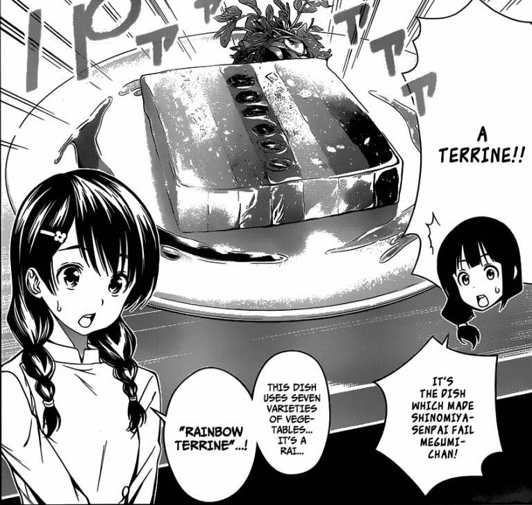 Shinomiya mostrou suas habilidades culinárias com legumes (ele é o mago dos legumes, hora) e agora é a vez de Megumi mostrar seu prato. Megumi está um pouco assustada (de novo), mas Souma consegue acalmá-la (de novo) e ela mostra seu prato: um “Terrine”. O prato que fez ela ser reprovada pelo Shinomiya.