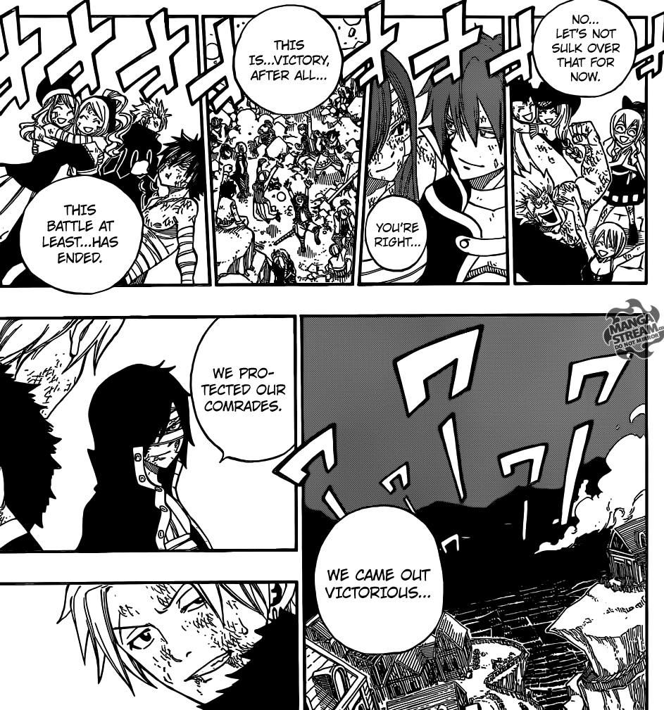 A cena segue com Sting se lamentando porque mesmo se derrotassem algum deles, não seria algo satisfatório, pois, nenhum daqueles estava ao nível de Acnologia. Mas com o aliviar da situação, nosso lindo Rogue vem com um dizer bastante lindo: “Não vamos pensar nisso agora, você está certo, afinal, todos nós saimos vitoriosos. Pelo menos esta batalha acabou, nós vencemos… protegemos nossos companheiros.”