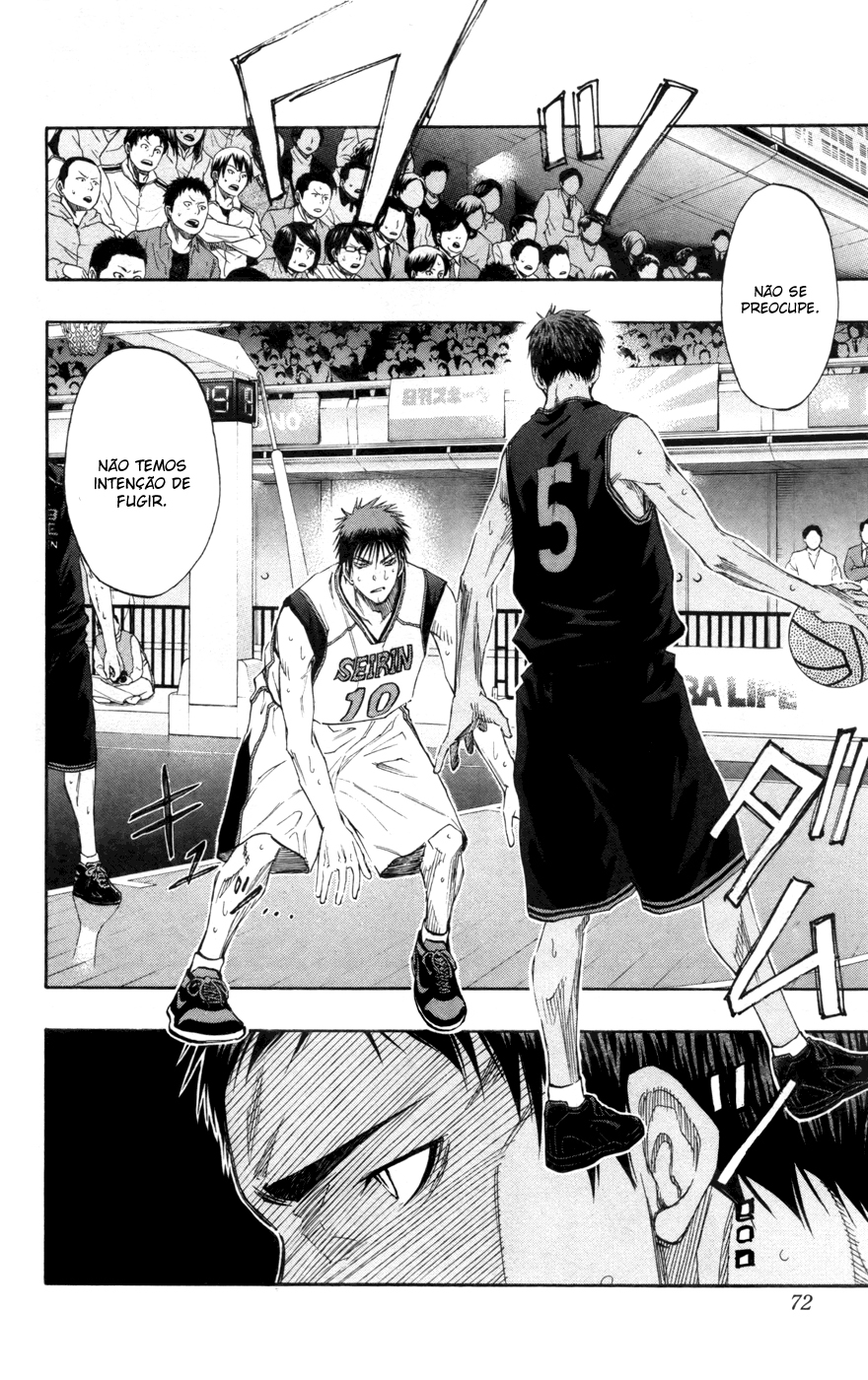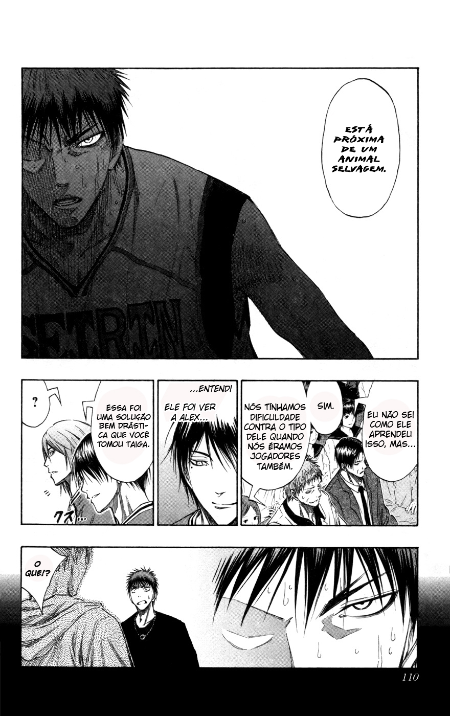 Auahsuahsuahshasuh alguém está delirando aí em cima, mas depois ele cai na real. Enfim, com o Aominecchi sério, é mais que óbvio que o jogo não foi mais o mesmo né. Depois de mostrar que ele ficou sério, o autor resolveu focar no duelo entre os dois, que não estava muito bem focado no 1º quarto. Percebemos que o que o Aominecchi falou não foi da boca pra fora, ele realmente jogou muito melhor depois de ter achado um oponente que não ficasse paralisado perante tanta habilidade, então ele parte para cima. E que ponto que ele faz, hein. Muito lindo. Começa com ele mandando a bola por baixo da perna do Kagamicchi…