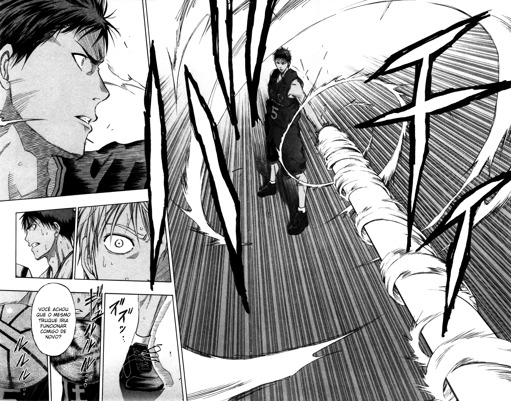 Bom, depois disso mostra a melhora de Kagamicchi no jogo, como ele consegue defender uma cesta que quase foi feita pelo Wakamatsu, e como depois ele quase fez um ponto da mesma maneira que o Aominecchi costuma jogar a bola, daquele jeito que dá a entender que a bola não vai entrar… e não entrou mesmo, mas o que vale é a intenção, não é mesmo?