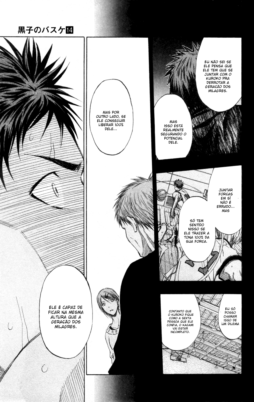Beleza então, vamos a parte que os leitores querem mesmo ler ^_^, essa parte foi muito tensa, afinal vimos Kuroko ter suas técnicas facilmente anuladas pelo fodástico Aomine (serio ele é o mais foda da geração dos milagres) mostrou bastante também que como um time completo a Tōō é muito superior a Seirin, e com Kuroko fora pra recuperar o fôlego agora ficamos com Kagami que prometeu mostrar pro Aomine que o trabalho duro vale a pena. É a liberação do Tigre da Seirin (ui) agora vamos voltar pro Lukas  U_U kkkkkkk.