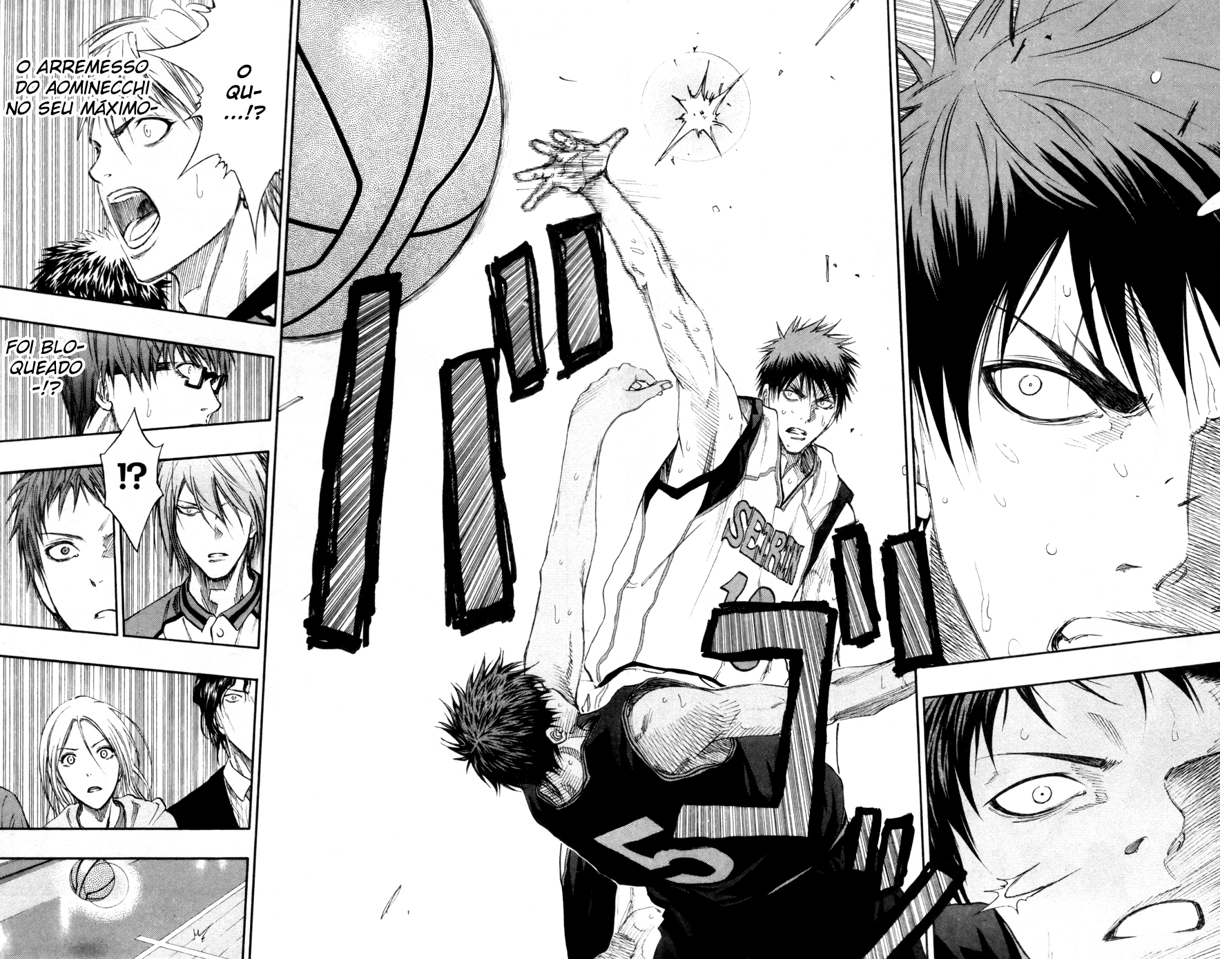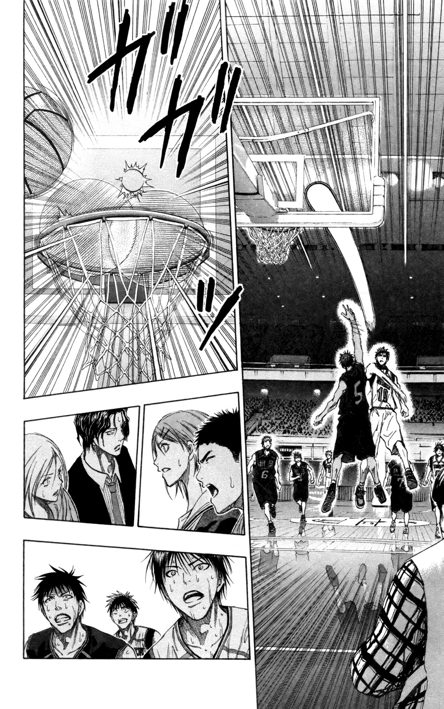 Depois que o seu drible que ele havia desenvolvido para acabar com a “geração dos milagres” foi interceptado, parece que o Kurokocchi ficou abalado (não é pra menos, afinal, se eu tivesse a minha melhor técnica desvendada tão facilmente assim…) mas ele também ficou um pouco nervoso, acho que a melhor palavra seria frustrado, e então fez uma merda. Ele resolveu usar o Ignate Pass Kai, para fazer a bola chegar até o Hyuga ou o Teppei que estavam a sua frente, só que ambos estavam sendo marcados, mas não foi esse o problema. Antes de a bola chegar a eles, ela teria que passar pelo Aominecchi, ou seja, coisa boa é que não vai dar… E não deu outra, Aominecchi consegui parar o novo passe de Kurokocchi, o que deve ter sido um puta choque para ele e para o time.