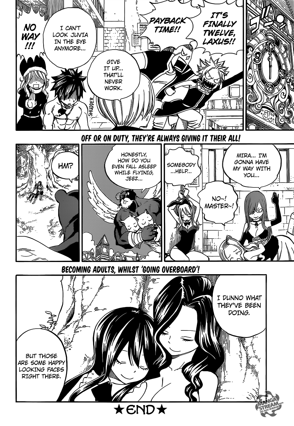 E assim o capítulo se conclui com muita gente revoltada querendo dar o troco, enquanto que outras estão tão calmas e serenas quanto o céu que apreciavam. Assim como o capítulo foi MUITO engraçado, ele nos trouxe uns momentos bastante fofos e comoventes, claro que nem tudo deveria ser só sacanagem, não é?! Só espero lançarem um OVA dele!! E claro que o Mashima não podia concluir essa saga dos dragões sem ao menos nos mostrar as punições que nossos amigos iriam receber! Só posso dizer que eu amo esses surtos de alegria que dão nele e que o levam a fazer capítulos como esse!