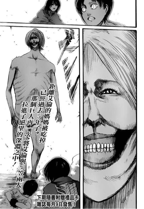 1. shingeki no kyojin e mesmo um manga fantástico não sei como a shonen jump conseguiu rejeitalo,e sobre o capítulo de hoje foi realmente surpreendente, estou ansioso para saber o que o eren e mikasa vão fazer ja´que encontraram o titan que assasinou a mãe deles.