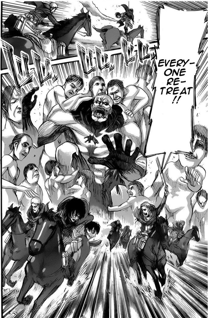 Tirando os sustos, o capítulo foi uma massacre. Se por um lado Irvin foi corajoso, ele também se mostrou extremamente frio  com relação a seus subordinados. Sua tropa foi, literalmente, destroçada, sobrando poucos para contar a história. Foi realmente uma estratégia de auto-sacríficio. Era tudo ou nada, não importando quem tivesse que morrer por isso, mesmo ele.