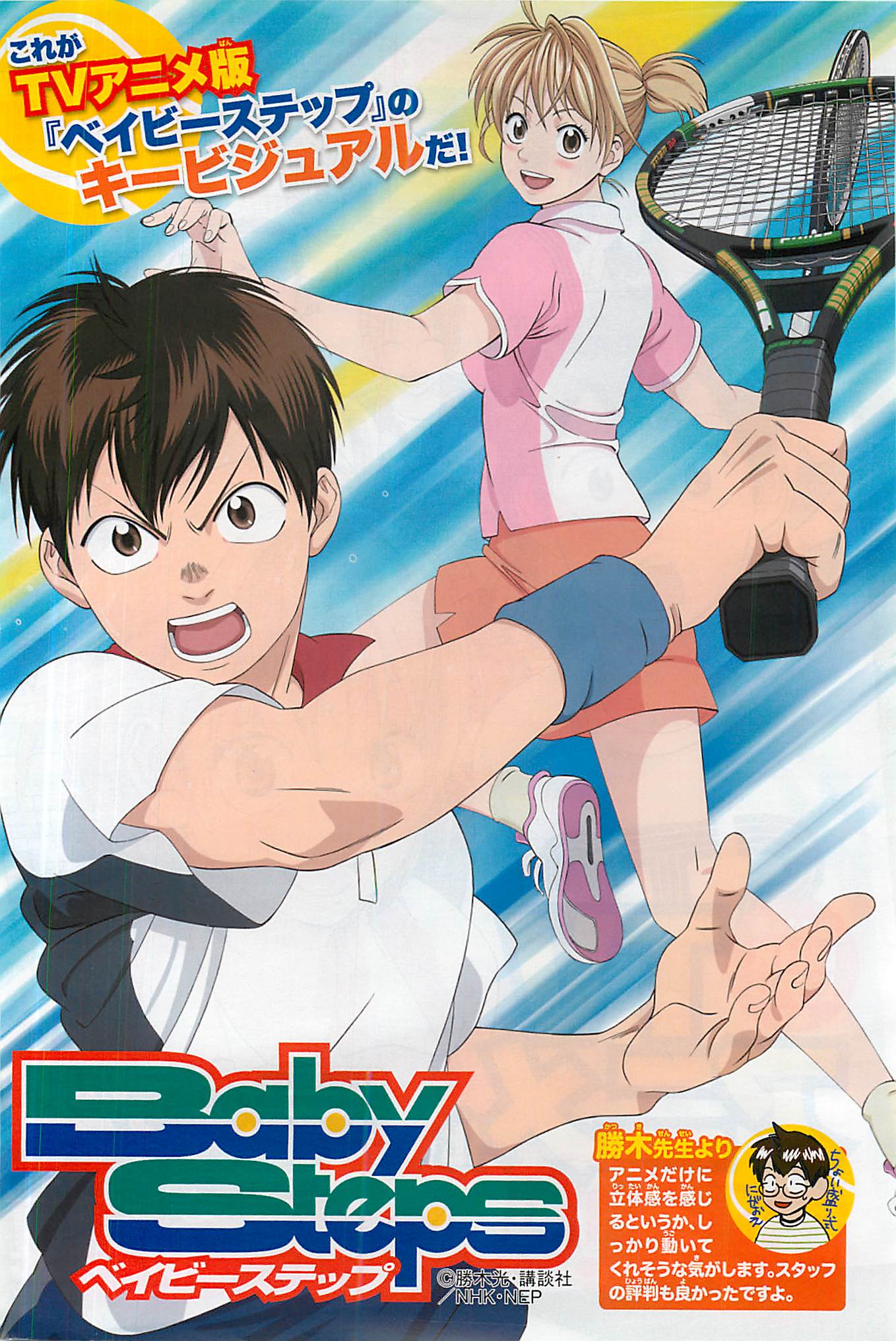 AEEAEEEE, Baby Steps teve um anime anunciado!! Pra falar a verdade eu já imaginava isso desde a semana passada, porque saiu uma info dizendo que teríamos ”big news” pro mangá nessa issue. Até o momento só sabemos que o anime será exibido na temporada de primavera de 2014, mais precisamente em abril do ano que vem, e que será transmitido no canal NHK. O character design ficou muito bom, como podem ver nas imagens da revista que estão aqui pelo post. A maior curiosidade fica por conta do estúdio e da staff envolvida no projeto. Torço muito para que seja uma equipe competente. O número de episódios só saberemos próximo a data de estreia do anime, mas espero muito que seja 2 cour. Quem acompanha a coluna há um bom tempo deve saber que eu já vinha dizendo que o próximo mangá da revista a ganhar anime deveria ser Baby Steps, por isso to feliz que acertei, mas principalmente porque gosto muito desse mangá. É realmente muito bom. Também fiz um post comentando a novidade que vocês podem acessar clicando AQUI.