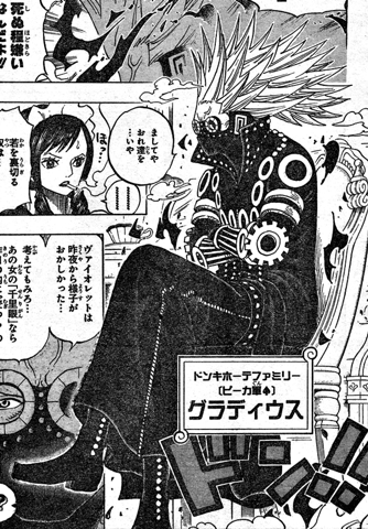 O circo vai fechando e, finalmente, alguns segredos que rondam Law vão aparecendo, como por exemplo, o fato de ter ocorrido algo 13 anos atrás, com uma pessoa que ele prezava muito. E tudo foi culpa do Doflamingo, é claro… Com o passado o chamando, Law determina que é melhor ele se sacrificar ali mesmo (na ponte que leva a Dressrosa) e que a aliança entre ele e Luffy está encerrada: não será Law quem destruirá Doflamingo, mas tudo bem para ele, já que confia nos mugiwara e acredita que ele será capaz de destruir a fábrica de Smiles, incitando a raiva de Kaidou, quem realmente mataria o jovem mestre. Demonstrando que seu alvo sempre fora o Doflamingo (quem percebeu que tinha algo errado foi o Sanji – Law estava muito fissurado na possibilidade de acabar com o Donquixote, ou pelo menos segurá-lo por um tempo). Obviamente, o shichibukai levou tal afronta como um insulto e mostrou superioridade a qualquer plano que ele pudesse realizar. Quando ele desmaia, quase morto, um nome aparece… Kora-san. Deixando a curiosidade no ar. Ah, e o Law deixa bem claro que ele não quer vingança, mas sim realizar o desejo da pessoa que ele admira… Reparem que sempre que ele chama alguém, ele fala “ya” e não “san”, então a Kora deve ter alguma importância fenomenal na vida dele.