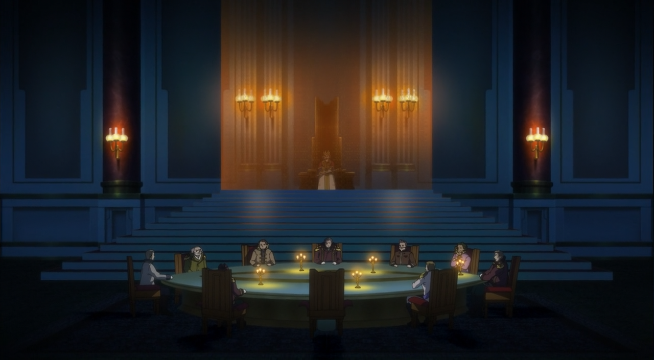 Começamos o Império da Consolação já com uma violenta morte! A princípio pensei que o cara que matou o emissário fosse aquele tal de Guy que vive passando infos pra Chaika sobre a localização de heróis com restos mortais. Até porque o cara que matou parecia meio criança ou bem jovem, daí imaginei que poderia ser o Guy. Mas depois, em uma reunião geral do império, os líderes falaram que o emissário foi morto no domínio do Duque Gavarni, então pode muito bem ter sido esse tal de Gavarni aí. O governo mandou o emissário até lá para pedir a devolução da fortaleza flutuante Soara. Pra terem matado o emissário e ainda mandado o corpo dele num estado horrível de volta para o governo como se estivessem lhes provocando, dá a entender que possa ter algo grande por lá. Não sei qual seria a importância de Soara a ponto do governo pedir a devolução da fortaleza flutuante e também a ponto de matarem o cara. Será mesmo que foi o Duque Gabarni o responsável? Será que ele é um aliado do Imperador Gaz?